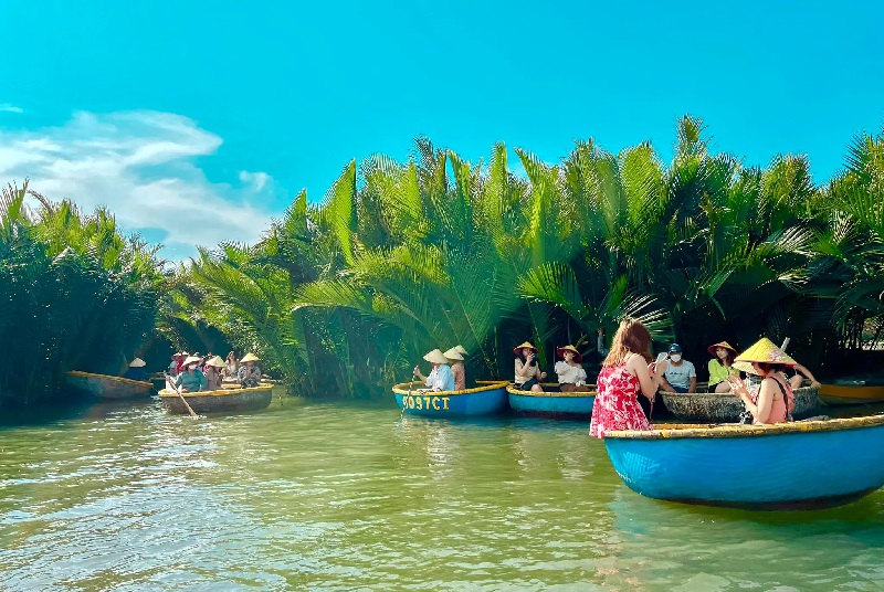 Tiếp theo là chúng ta du ngoạn cảnh sắc tuyệt đẹp nơi rừng dừa Cẩm Thanh. Trải nghiệm đi thuyền thúng, chiêm ngưỡng vẻ đẹp của dòng sông, rừng dừa, trò chuyện cùng những ngư dân thật thà, mến khách. Thưởng thức màn trình diễn chèo thuyền và đánh bắt cá của người dân địa phương. Tham gia vào hoạt động làm quà lưu niệm bằng lá dừa và xem một màn biểu diễn thuyền thúng trước khi quay về